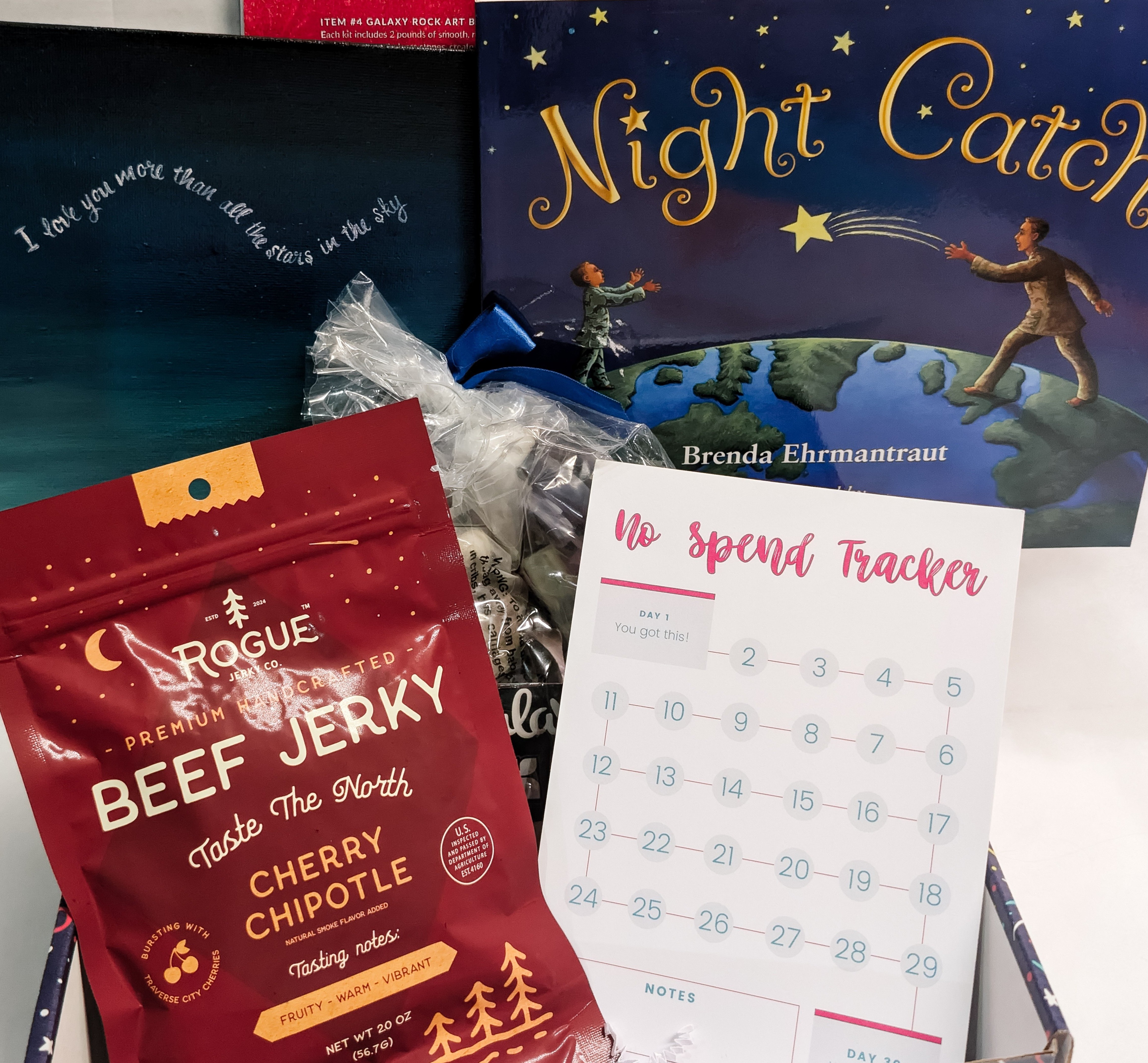 NIGHT CATCH BY BRENDA EHRMANTRAUT: "When a soldier’s work takes him half-way around the world, he enlists the help of the North Star for a nightly game of catch with his son. Night Catch is a timeless story that connects families while they are apart and offers comforting hope for their reunion. CHERRY CHIPOTLE BEEF JERKY BY ROGUE JERKY CO: Bursts with the flavor of Traverse City cherries, perfectly balanced by the smoldering heat of chipotle. This handcrafted beef jerky is a tribute to Northern Michigan—sweet, spicy, and unmistakably Rogue. STARRY I LOVE YOU COUNTDOWN WALL ART BY BLACKROSEWOODART ON ETSY: Deployment tracker; Count down by counting up! One gemstone “star” is added for every day your loved one is away so that by the time he/she gets home there’s a sky full of stars and a completed piece ready for display. GALAXY ROCK ART BY HORIZON GROUP USA: Each kit includes 2 pounds of smooth, ready-to-paint rocks in assorted sizes. Create multiple works of art, or build a Mega rock sculpture. Kindness stones: create colorful Rock Art to place around Town or in parks. Leave a short note to go along with your stone and make someone's day! (PARENT TOOL) NO SPEND TRACKER: One of the best ways to stretch a dollar is to simply not spend it. See how long you can go when you challenge yourself to have "no spend days," turning a not-so-fun activity into a game. 25 sheets in each notepad, enough for over 2 years of challenges. ONLINE TRAINING: NO SPEND CHALLENGE: I don't know about you, but after the holidays and in the middle of what my family terms as "birthday season," I find myself spending more and more money. I found this neat little "no spend tracker" to include as a parent tool for the month and I thought how great would it be to challenge our selves to spend less money for the month. Each sheet has 30 days on it and all you do is cross off a day if you were successful in not spending money. Obviously, we have our basic expenses, but we can be more thoughtful in how we spend, when we buy gas and groceries, etc to have more "no spend days " throughout the month. Check out our FB group for a quick tutorial on how to use the tool and then start this 30 day challenge.