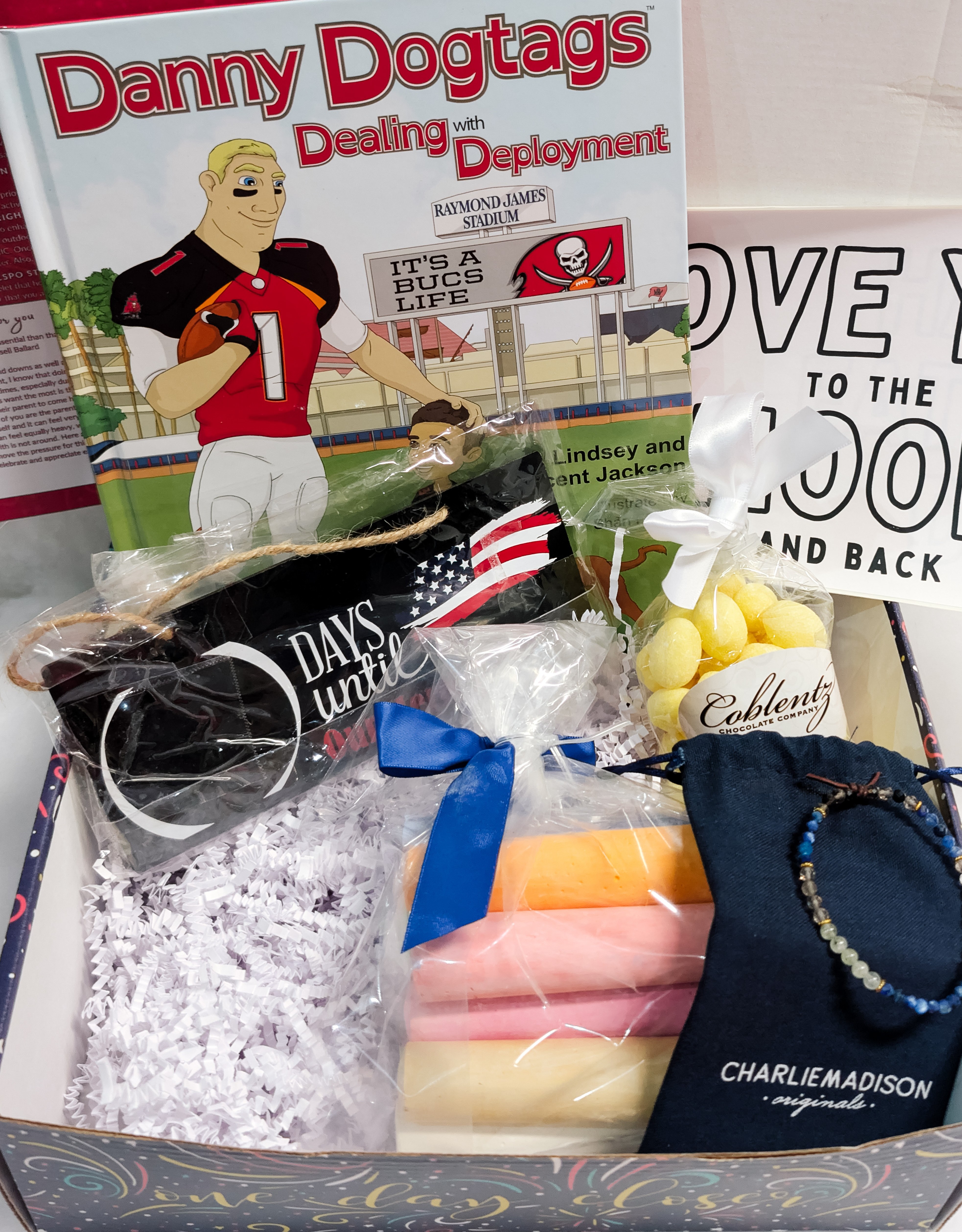 DAYS UNTIL OUR HERO IS HOME CHALKBOARD COUNTDOWN BY OHANAJULES ON ETSY: These cute chalkboards are perfect for all family members to count down the days until you’re loved one is back home. DANNY DOGTAGS: DEALING WITH DEPLOYMENT BY LINDSEY & VINCENT JACKSON: Danny isn't happy that his dad, a major in the US Army, has to leave for a deployment. Not long after hearing the sad news, he meets and befriends a player from the Tampa Bay Buccaneers and realizes he isn't alone. SANDED LEMON DROPS BY COBLENTZ CANDY COMPANY: These smooth, sugar-dusted shells that dissolve slowly to reveal a tangy, mouth-puckering lemon core. They start off sweet, then twist into a sharp citrus zing that lingers pleasantly on the tongue. LOVE YOU TO THE MOON AND BACK CARE PACKAGE STICKER KIT BY SEA TO SEA WITH LOVE: Care package sticker kit for large flat rate priority mail box. Add your own touch to the personalization of this care package for your deployed parent. Check out this month's activity for how to put this together. (PARENT TOOL) 10 BRIGHT AND CHEERFUL CHALK STICKS (1X4) BY SIDEWALK CHALK: 10 different colors which you can use to enhance your child’s visual perception, cognitive skills, creativity and imagination. These rich and vibrant colors help them to create outdoor arts on the sidewalks and play sidewalk games like Hopscotch, Tic-Tac-Toe and Four Square. WASHABLE AND NON-TOXIC. Once the activities are finished, you can easily wipe them off with a damp cloth or wash them away with a quick spray of water. Also, the colors are easy to remove from the clothes and 100% kids safe. (BONUS ITEM) MILSPO STRONG MINI BRACELET BY CHARLIEMADISON ORIGINALS: A meaningful military spouse bracelet that honors the love and strength of your milspouse tribe - they know you because they are one of you. An everyday reminder that you are not alone on this journey, no matter where the military sends you. ONLINE TRAINING: CHALK CONVERSATIONS WITH KIDS: This month, isn't so much a training as it is a fun reminder for all parents; including me. I thought it would be fun to guide you all through leaving positive, kind uplifting messages to your kids, via sidewalk chalk. Sometimes without even noticing, my kids do this for me, so why not return the favor. Are they tackling a hard day, trying to over come a sports injury or tough game, or are you just wanting to let them know you are thinking about them? It can be something that is waiting for them when they come home from their summer activities/daycare or a positive message to start their day. Why not also do this together and just color pictures. You can also bring this out into your community to spread kindness and write positive messages for those around you.